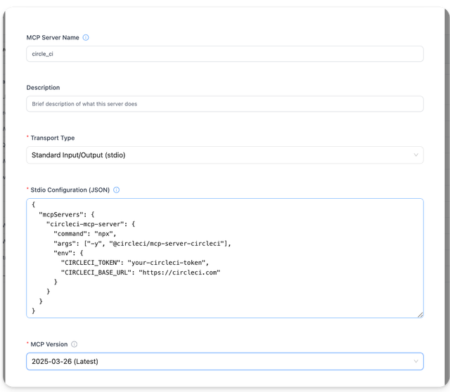 For stdio MCP servers, select "Standard Input/Output (stdio)" as the transport type and provide the stdio configuration in JSON format: